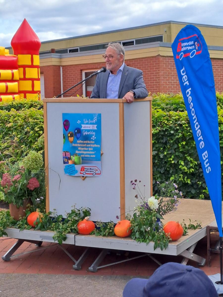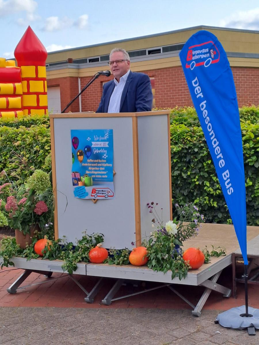 „Es war ein sehr gelungenes Fest“, konnte das Organisationsteam vom Bürgerbus Badbergen e.V. resümieren. Zur Feier anlässlich des 10. Jahrestages der Betriebsaufnahme des Bürgerbusses hatte der Verein eingeladen und viele waren zum Mitfeiern gekommen. Ein buntes und vielseitiges Programm hatten die Verantwortlichen zusammengestellt und die Umsetzung klappte hervorragend. Nach der Begrüßung durch Heiner Engebrecht, der die Moderation kurzfristig übernommen hatte, ließ Michael Szymanski, der Vorsitzende des Vereins, den Blick von der Gründung bis in die Zukunft schweifen. Viele, die für den Erfolg des Bürgerbusses stehen, konnte er bei der Veranstaltung willkommen heißen. In den Grußworten von Nikolaus Jansen, der den verhinderten Minister Lies vertrat, und von Dr. Winfried Wilkens vom Landkreis Osnabrück wurde die wichtige Bedeutung ehrenamtlicher Tätigkeiten für das Gemeinwohl deutlich. Glückwünsche der Samtgemeinde Artland und der Gemeinde Badbergen überbrachten Gerd Beckmann und Werner Meier bevor Alfons Mechlinski von Pro Bürgerbus Niedersachsen, dem Dachverband der niedersächsischen Bürgerbusse, deutlich machte, dass neben dem ÖPNV-Angebot auch ein lebendiges soziales Netzwerk durch die Bürgerbusse gebildet wird.